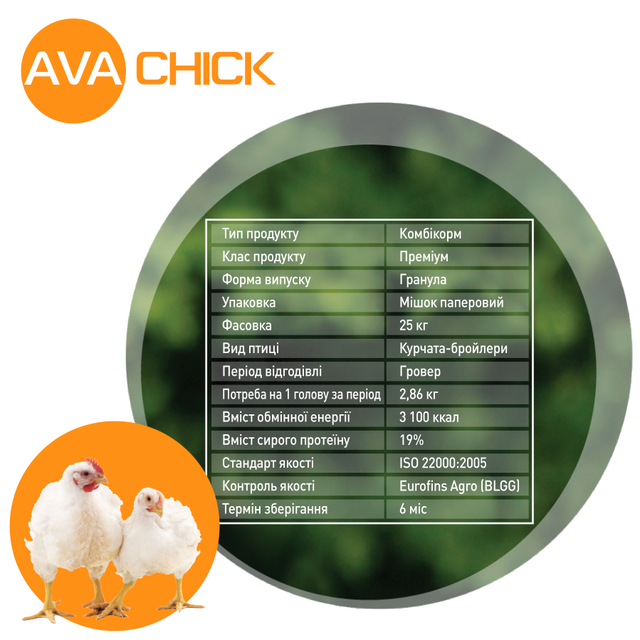 Продукція лінійки AVA CHICK допоможе ефективно використовувати генетичний потенціал птиці, забезпечить високі показники продуктивності та економічної ефективності виробництва м’яса птиці за рахунок високоефективної годівлі преміум класу у відповідні періоди вирощування